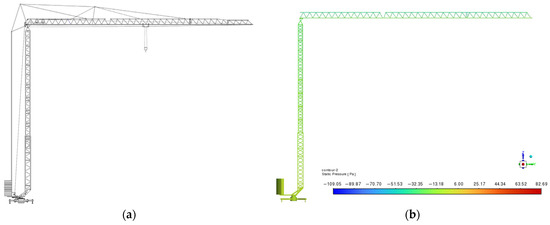 The object of study: 63 K crane: (a) real structure; (b) pressure distribution as a result of the CFD simulation.