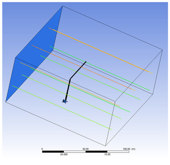 In Figure 6, the finite cell mesh is generated automatically by the ANSYS Fluent Mesh module. It is assumed that the minimal length of the cell edge is equal to lmin = 0.028 m (value independent of the geometry configuration), and the maximal length of the cell edge is generally greater than lmax > 6 m, depending on the geometry configuration.