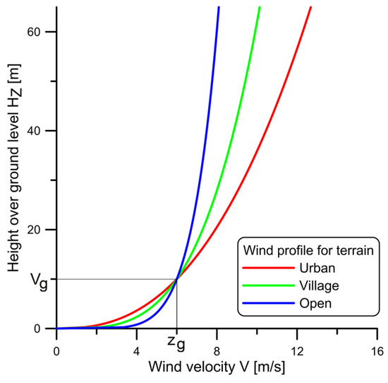 where vg is the wind velocity measured at the height zg over the ground level. The exponent α takes values of 0.4, 0.28, and 0.16 depending on the type of terrain, namely urban terrain, village terrain, or open terrain, respectively. In the current work, we arbitrarily assumed that in all studied cases vg = 6 m/s at the height zg = 10 m. In Figure 5, the assumed wind profiles are shown.
