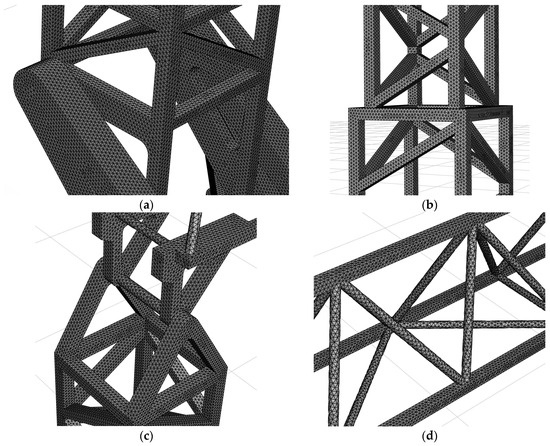 The finite cell mesh: (a) basis of the tower; (b) tower lattice; (c) join of the tower and jib; (d) jib lattice.