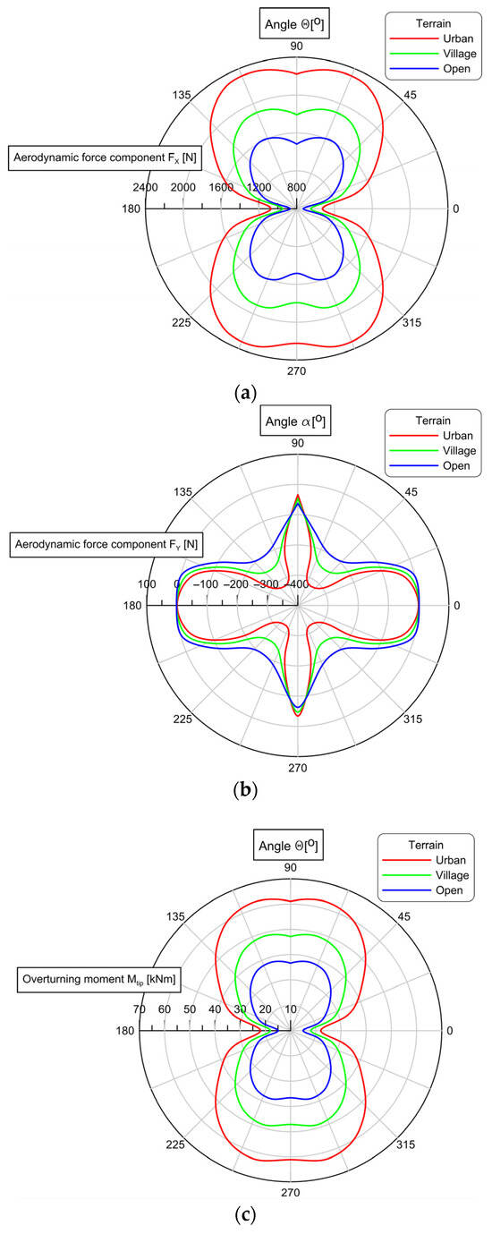 The values of aerodynamic forces (a) FX component, (b) FY component, (c) overturning moment M, estimated concerning the tipping line (Figure 7), for the wind speed vg = 6 [m/s] measured at 10 m over the ground.