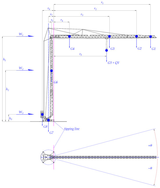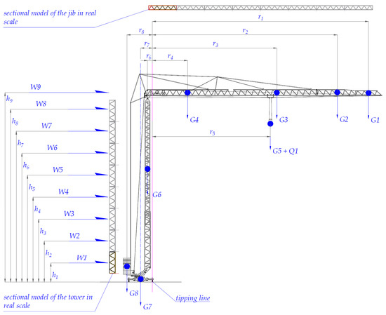The overturning moments are equal to the sum of the moments caused by the masses of the particular parts of the crane jib G1–G4 without the external load but with the aerodynamic force generated by the wind taken into account, as shown in Figure 9. The geometrical dimensions as well as the masses of the structure elements are assumed according to the technical and commissioning documentation [37]. Therefore, it should be noted here that the mentioned parameters are estimated with a certain approximation, and they should not be treated as data provided by the producer. The test object itself is treated as an example for calculating the stability of a low-slewing crane.