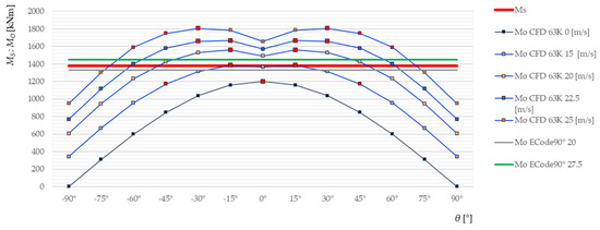 The estimation of the wind force W according to the standard [41] is based on the reference area Aref of the whole supporting structure of the tower crane and the air pressure, which acts on the structure under assumed wind speed vg = 6 m/s at the height H = 10 m above the ground level for the urban terrain. Due to the significant changes in the wind force together with the increasing height of the tower crane, the reference area Aref was split into three parts, namely: Aref1 = 11.04 m2 of the crane jib, Aref2 = 12.35 m2 of the tower, and Aref3 = 3.91 m2 of the counterweight. It should be stressed that according to various standards [39,40,41,42,43,44,45,46], the load induced by the wind, which acts on structures, is treated as a static normal pressure subjected to the external surface of a designed structure. Therefore, it is assumed that the wind pressure p = 245 N/m2 corresponds to the wind speed equal to v = 20 m/s. Thus, for a particular reference area and wind speed vg = 6 m/s at height h = 10 m the following forces are obtained, namely: for Aref1, where h1 = 33.81 m, W1 = 359.6 N; for Aref2, where h2 = 20.33 m, W2 = 341.84 N; and for Aref3, where h3 = 2.83 m, W3 = 57.5 N. Regarding the fact that the value of W3 is relatively small in comparison with the other ones (as well as the small height and large mass of the counterweight), in further computations, the overturning moment induced by this wind force was neglected. The obtained results MO ECode90° as a sum of the overturning moments MO (Table 4) and the moments induced by wind MW ECode90° [41] with the wind force taken into account are shown in Figure 10 as a constant value, which is independent of the rotation of the jib.
