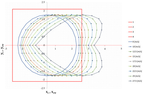The trace of the center of gravity, depending on the angle θ of rotation of the crane jib, generates the closed contour. This curve can be described with the help of the guiding ray. Below are the formulas describing the guiding ray in the case of a lack of wind rc and in the case where the wind is present rcw. The guiding ray is defined by its coordinates xc, yc and xcw, ycw: