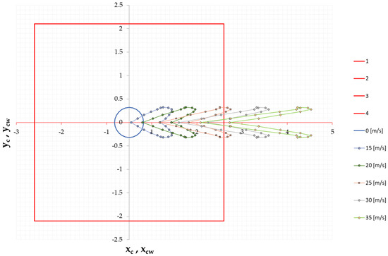 Finally, it is worth noting that the most dangerous configuration of the tested crane is the one for which the angle θ = 15° with load and θ = 45° without load. These configurations correspond to a critical wind speed of v = 14.9 m/s (53.6 km/h) and v = 28.3 m/s (101.9 km/h), respectively. The obtained values agree with the wind speed that caused the crane disaster in Cracow (Poland) in 2023 [1,2]. This is particularly important because during the safe configuration of the crane (the boom is aligned parallel to the wind direction), a sudden, strong gust of wind is capable of toppling the entire crane, as can be seen in the figures, which show the trace of the center of gravity.