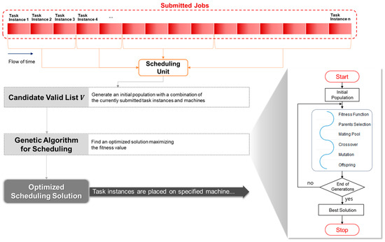 Our genetic algorithm operates by taking a list V containing pairs of <machine, task instance> as its input. Initially, V is designated as the starting set of solutions, and its fitness value is computed. The algorithm then proceeds with iterative generations to find the most superior solution. Parents are chosen to produce offspring in the mating pool, followed by the execution of a crossover operation. Subsequently, an adaptive mutation is introduced to generate the succeeding set of solutions. Then, the fitness values for the newly generated solutions are evaluated. This iterative process is repeated across multiple generations until the population converges. Finally, the best solution from the generated population is selected to determine which machine within the cluster each task instance will be assigned to. Figure 3 briefly illustrates the overview of our genetic algorithm.