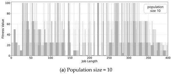To determine the population size, we investigate the relationship between the population size and fitness function ranges. Figure 5 shows the fitness value of the final selected solutions when the population size is set to 10, 100, and 1000, respectively. As shown in the figure, a population size of 10 does not produce competitive results in terms of fitness value, but the fitness values are very similar when the population size is 100 and 1000. We choose a population size of 100, as it incurs a low overhead but exhibits sufficiently good results. Based on this, we randomly generate 100 solutions as the initial population.