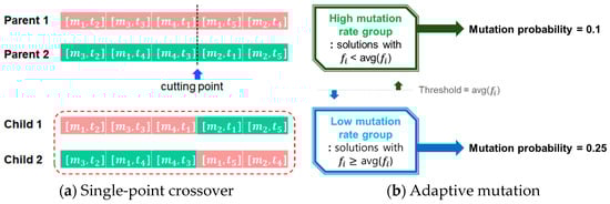 After selection, crossover procedures are applied to the chosen parent solutions to produce offspring solutions for subsequent generations. This process involves combining parent solutions to yield new solutions, known as children, thereby facilitating the enhancement of the population over time. In our genetic algorithm, a widely recognized single-point crossover technique is employed to generate fresh offspring solutions. In a single-point crossover, each parent possesses a single cutting point, and the offspring are derived by replicating distinct segments of each parent’s solution based on this point. In the context of our scheduling, offspring solutions are created by interchanging combinations of machines and task instances through the single-point crossover operation, as illustrated in Figure 7a.