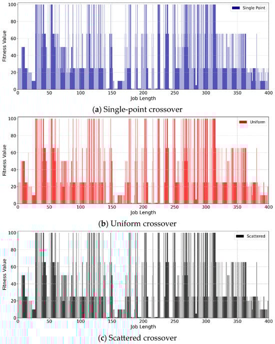 To assess the effectiveness of our single-point crossover operation, we investigate its fitness value in comparison with two other popular crossover operations: uniform crossover and scattered crossover. As shown in Figure 8, the three crossover methods exhibit very similar results. We chose the single-point crossover as it is the simplest among the three considered, yet it still exhibits competitive results.