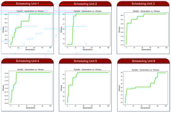 To ensure the convergence of the genetic algorithm we implement, we assess its performance by comparing the fitness metrics of individual solutions within the existing population over time. Figure 9 illustrates the trend of fitness values observed throughout the genetic algorithm’s evolution, where the fitness values steadily increase towards the maximum possible value across successive generations within a specific scheduling unit. This graphical representation clearly delineates the evolutionary trajectory of the population as it seeks to pinpoint the optimized solution by applying the genetic algorithm to each scheduling unit. Additionally, this visual aids in monitoring the gradual convergence of fitness values as generations progress within each scheduling unit.