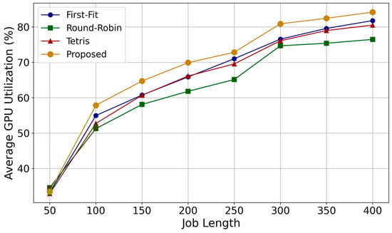 Tetris and First-Fit exhibit similar GPU utilization patterns, with each algorithm alternately gaining and losing advantage over time. Note that the Tetris algorithm schedules tasks by projecting each task’s resource demands into Euclidean space and selecting the task–machine pair with the highest dot product, proving suboptimal for maximizing GPU utilization. As shown in the figure, however, the proposed algorithm consistently achieves the best results in terms of GPU utilization across the cluster. This is due to the optimized selection of task–machine pairs in terms of GPU utilization, leading to the minimized fragmentation of GPU resources across clusters. The improvement of the proposed algorithm against Round-Robin, First-Fit, and Tetris in terms of GPU utilization is 12.8%, 6.5%, and 6.6%, respectively.