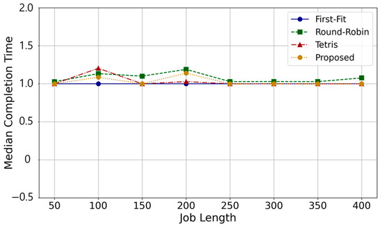 Even if GPU utilization increases, a performance penalty may occur from the user’s perspective. To validate this, we measure the completion time of jobs for each algorithm and compare the results. Figure 11 depicts the completion time of jobs when scheduled using our proposed algorithm and the comparison algorithms, First-Fit, Round-Robin, and Tetris. The completion time of each job is calculated by subtracting the start time from the finish time of the job. The graph illustrates that our algorithm achieves completion times for scheduled jobs like those of the other three algorithms, implicating that it can perform scheduling without a performance overhead. This demonstrates the efficiency of our algorithm in handling job scheduling, while maintaining a competitive performance from a user perspective.