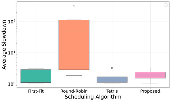 In our study, the aim of the genetic optimization is to improve GPU utilization, and thus the fitness function was defined accordingly. So, our optimization does not explicitly consider the waiting time of each task when evaluating solutions. However, as GPU utilization improves, the overall waiting time for tasks is also reduced, by maximizing the activation of idle GPUs. To demonstrate this, we show the average slowdown of tasks for each algorithm in Figure 12. As shown in the figure, our scheduling performs significantly better than Round-Robin scheduling with respect to the average slowdown of tasks. Of course, our scheduling does not address fairness issues related to the waiting times of individual tasks, which may lead to some tasks experiencing longer waits. However, the fairness issue is not explicitly considered by other algorithms either, and it is not significantly problematic in our algorithm, as demonstrated by our experimental results. Nevertheless, if addressing this issue is indeed necessary, it is possible to define a fitness function that imposes penalties when there is a significant variance in the waiting times of tasks.