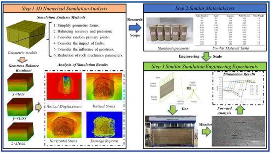 The preliminary geological investigation data, in conjunction with the study area’s pull–down plan, indicate that the pull–down profile is situated at a vertical elevation of 70 m. Consequently, the area above elevation 0 is considered the study object in the actual modeling, and no air–mining zone exists in the area. The No. II ore body, located between elevations of −100 and +300 m and exploration lines of 1076 and 1098, is employed as the collapsed object to construct a three–dimensional numerical model. To ensure both simulation accuracy and computational efficiency, a balanced approach is taken in constructing the computational model. Commencing from the central plane of the ore body, bottom extraction is initiated, proceeding in a progressively expanding square pattern. At each stage of bottom extraction, considerations extend to the ore discharge’s influence. This study delineates the initial avalanche area and subsequent areas of avalanche progression until the entirety of the ore body’s horizontal extent is subjected to bottom extraction. Examination encompasses stress concentration patterns on the bottom plate and the resulting damage morphology within the fallout area. The flow chart of the proposed method is shown in Figure 2.