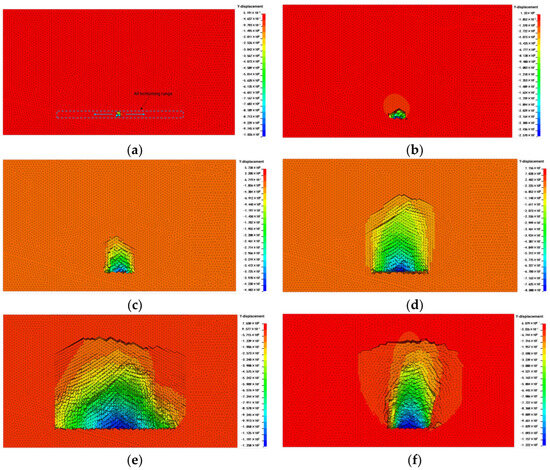Vertical displacement of the ore body during the bottoming process: (a) Step 1, (b) Step 3, (c) Step 5, (d) Step 10, (e) Step 15, and (f) Step 21.