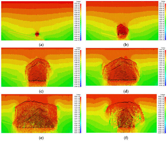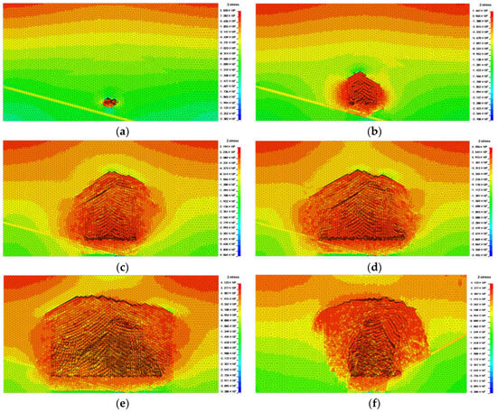 Figure 6 depicts the redistribution of vertical stress resulting from bottom pulling disturbance, leading to a noticeable low–stress unloading area around the undercut area. Moreover, significant unloading is observed within the fault fracture zone, marked by the black line area in the lower left corner of Figure 6a–e and in the lower right corner of Figure 6f. As the bottom pulling range expands, gradual collapse occurs due to damage to the top plate from pulling, intensifying stress redistribution and forming an unloading funnel (see Figure 6a,b). However, stress concentration is evident in the local area surrounding the fall arch, restricting the deformation of the top and bottom plates (see Figure 6c). The vertical stress unloading area deflects towards the side of the fault crushing zone. During the second ore release, Figure 6d depicts the top plate ruptured from the rock body above the pull–down area, resulting in a collapse to a height of 260 m (measured from the bottom surface of the pull–down area to the top of the fallout arch). This rupture leads to further stress release on the top plate, although a significant increase in localized stress concentration around the fallout arch is observed, exceeding 40 MPa at its maximum, with the highest concentration located internally within the model. Upon the completion of the bottom pullout, Figure 6e,f depicts the maximum vertical stress approached 60 MPa, with the highest concentration still located internally within the model.