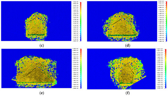 In order to further reflect the change in the stress around the bottoming region during the bottoming process, the cloud diagram of the horizontal stress at each bottoming step is given in Figure 7. From the Figure, it can be seen that when the range of the drawdown region is small, the horizontal stress release in the crushed zone around the drawdown region is small, but it does not have much effect on the stress field of the whole model; with the increase in the drawdown step, the horizontal stress release in two gangs of the drawdown region is obvious and the horizontal stress release in the interior of the fault crushed zone is obvious, the horizontal stress release area is deflected to the side of the fault crushed zone, and the formation of an obvious stress concentration over the arch in the drawdown region occurs (Figure 7c); when the bottoming step reaches 15 steps, because the rupture area has been extended to the rock body above the bottoming area, the horizontal stress distribution gradually loses symmetry; when the bottoming step is completed, the rupture area is more than the whole ore body, and the horizontal stress distribution is asymmetric. For the horizontal concentrated stress around the drawdown area, its amplitude shows the trend of increasing first (Figure 7a–c) and then decreasing gradually (Figure 7c–f), and the maximum horizontal concentrated stress is 40 MPa.