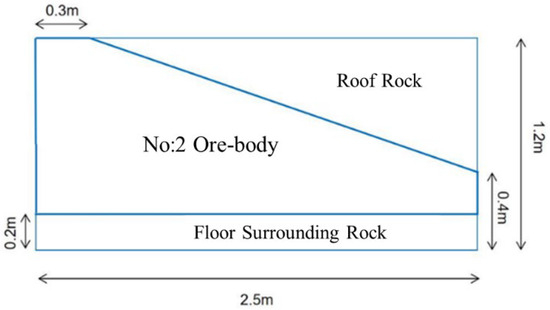 The experiment employed the CM250/18 planar test rig with a model measuring 250 cm in length and 120 cm in height, yielding a geometric similarity ratio of 200. The bulk similarity ratio was set at 1.5, the strength similarity ratio at 300, and the time similarity ratio at 10. The model featured the ore body in its middle section, with the upper plane aligned to the average inclination angle of the ore body, and the peripheral rock surrounding the ore body. The specific model design is illustrated in the accompanying figure.