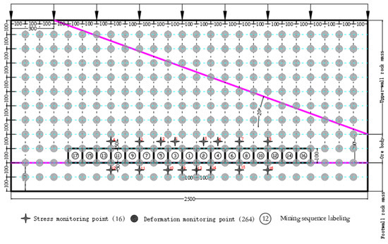 Based on the findings from similar material proportioning experiments, a comprehensive analysis is conducted to establish the construction of a similar model using proportioning numbers. The similar model was paved in conjunction with the pre–designed scheme and arrangement of the test elements. The paving process involved laying one layer every 20 mm from the bottom, with mica evenly distributed in the middle, and loading the unpaved rock layer above based on the buried depth load using a lever scale. The model is equipped with two rows of 16 pressure boxes, which collect data on the stress distribution of the overlying rock as the excavation width increases. These pressure boxes also monitor changes in the upper and lower plate stress levels after excavation. The pressure box data collection uses Donghua Testing Company’s static DH3815N collector, which is set to collect data five times per minute. Deformation at measuring points is observed using the digital scattering correlation method. After air–drying the model and removing the beams, a black line is drawn on the surface at 10 cm intervals, marking three–dimensional photographic observation points. Photographic coding points and scales are affixed at 10 cm intervals around the model’s edges, and a camera monitors rock displacement during stabilization and excavation. A special camera was used to capture photographs during both the loading and stabilization of the model, as well as throughout the excavation process, to monitor rock displacement changes. The model surface is equipped with 240 measuring points arranged in a 10 × 24 grid to analyze overburden movement during mining. Adjacent measurement points are spaced 10 cm × 10 cm apart, with the bottom row positioned at the ore body’s bottom plate. Displacement monitoring points are arranged according to Figure 10 and Figure 11.