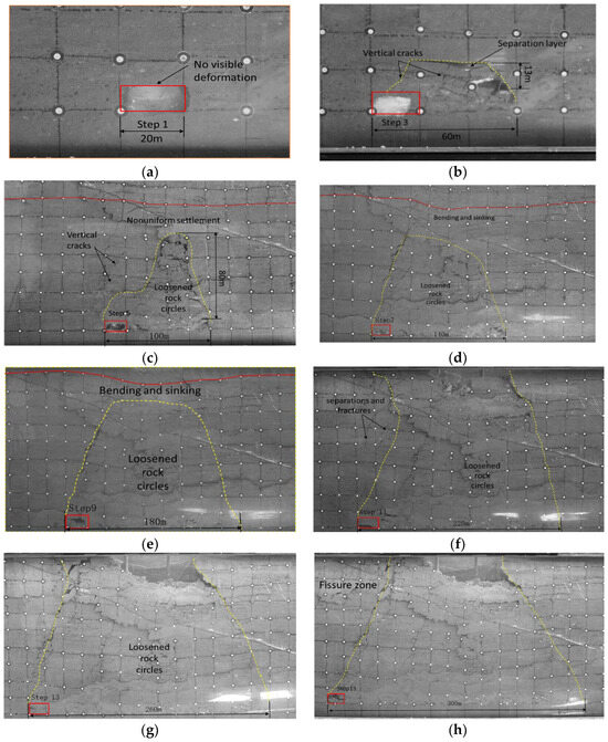Following the completion of bottom pulling in the model, the damage patterns of the ore body and overburden rock are observed, and the collapse phenomenon is studied and analyzed. Figure 13a–h illustrate the deformation and destruction of overburden rock at various stages of bottom pulling. It is observed that after each bottom pull, a collapse space forms between the bottom pulling roadway and the ore body, disrupting the original equilibrium among the top plate, bottom pulling layer, and bottom rock layer. This disruption leads to stress redistribution and establishes a new equilibrium as mining progresses. During this process, the ore body will experience various forms of movement, including bending, collapsing, breaking, rotating, and bulging. The test results indicate clear zoning for the collapse and destruction of the rock layer, progressing from the fall zone at the bottom, through the fissure zone, to the bending and sinking zone at the top. As the burial depth decreases, the deformation range of the overburden rock gradually expands, while the degree of destruction gradually diminishes.