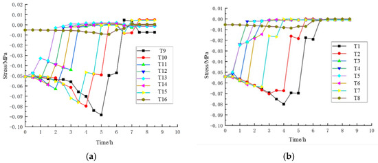 Figure 14b displays the stress curve of the bottom plate of the advancing excavation roadway. It reveals a cyclic stress pattern as the excavation layer width advances on both sides. During bottom pulling work, stress from the overlying rock movement transfers to the bottom plate, creating stress concentration [38]. As the roadway advances, measurement points within the stress concentration area transition to pressure relief zones, leading to stress reduction until reaching 0 overburden pressure. Measurement points further from the roadway exhibit similar trends, with higher peak stress levels.