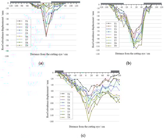 Schematic diagram of the top plate displacement and sinking: (a) advancement of drawdown width to 80 m, (b) advancement of draw-down width to 120 m, and (c) advancement of drawdown width to 170 m.