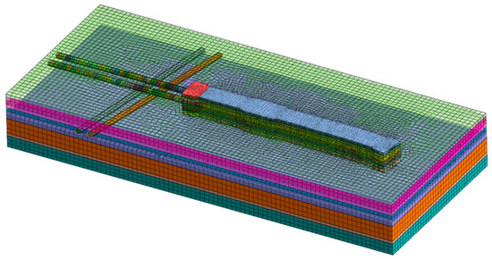 The subsurface conditions mainly determine the model’s lower boundary extension depth. A hard soil layer beneath can serve as the model’s lower boundary. Since soil stiffness increases with depth, a lower boundary situated well below the foundation pit’s bottom exerts a minimal impact on the calculated results [47]. Given that the level below 47.5 m in this instance is a moderately weathered rock layer, the height of the model was set to a depth well beyond the foundation pit, specifically at 60 m.