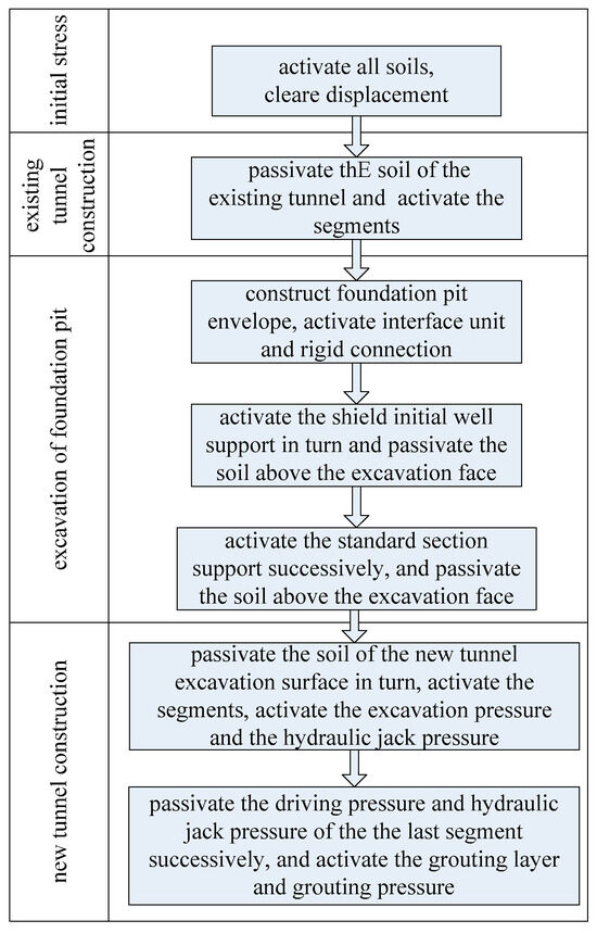 In stage 1, the initial stress stage, all the soil layers were activated, and the displacement was cleared to zero. In stage 2, the existing tunnel construction stage, the soil of the existing tunnel portion was frozen, and the existing tunnel element was activated. In stage 3, the foundation pit excavation construction stage, we constructed a foundation pit envelope and activated the interface unit and rigid connection; thereafter, we activated the shield’s initial well support and passivated the soil above the excavation face. Lastly, we activated the standard section support successively and passivated the soil above the excavation face. In stage 2, the new tunnel construction stage, we passivated the soil of the new tunnel excavation surface in turn, activated the segments, and activated the excavation pressure and hydraulic jack pressure; thereafter, we passivated the driving pressure and hydraulic jack pressure of the last segment successively and activated the grouting layer and grouting pressure. Through the above steps, the numerical simulation of the construction phase was realized in the finite element software. The detailed steps are shown in Figure 5.