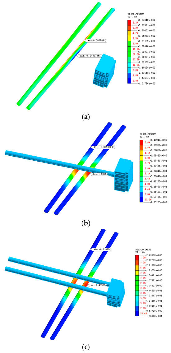 Vertical displacement cloud image of an existing tunnel subjected to several disturbances. (a) Vertical displacement cloud image of an existing tunnel subjected to the foundation pit (b) Vertical displacement cloud image of an existing tunnel subjected to the new right-line tunnel (c) Vertical displacement cloud image of an existing tunnel subjected to the new left-line tunnel.