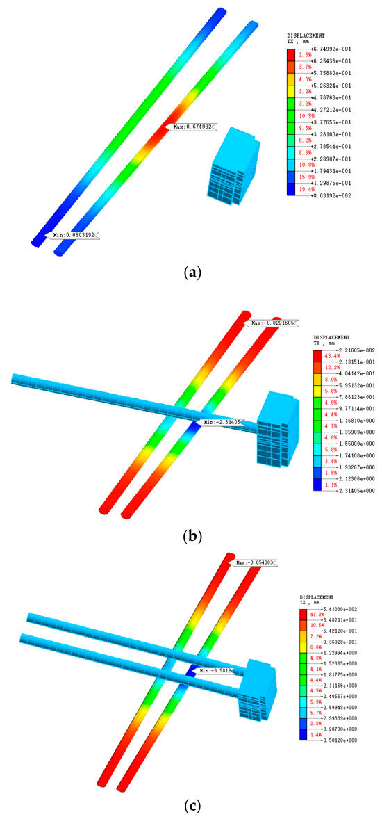 Horizontal displacement cloud image of an existing tunnel subjected to several disturbances. (a) Horizontal displacement cloud image of an existing tunnel subjected to the foundation pit (b) Horizontal displacement cloud image of an existing tunnel subjected to the new right-line tunnel (c) Horizontal displacement cloud image of an existing tunnel subjected to the new left-line tunnel.