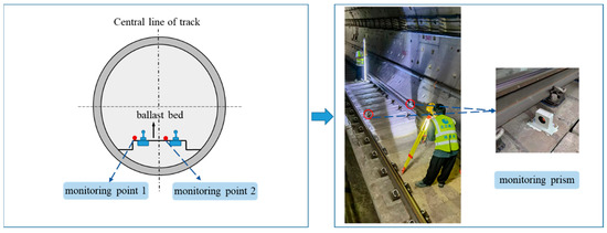 The TM50 total station produced by Leica (Heerbrugg, Switzerland) was utilized to monitor the deformation of the existing Line 1 tunnel automatically and manually check it regularly in this project. The monitoring focused on the excavation of the foundation pit and the new Line 7 shield crossing the existing line. Two stations were arranged in the upper and lower sections of the track operation area of Line 1, forming two automatic monitoring networks. The monitoring length of each section was approximately 200 m. A monitoring section was arranged every five rings in Section Line 1 for the foundation pit construction stage of the station, which corresponded to the projection range of the foundation pit, and a monitoring section was arranged every ten rings outside the projection range. In the construction phase of the shield tunneling machine of Line 7 across Line 1, a monitoring section will be arranged every 2 to 3 ring intervals in the projection range and 15 m outside the projection range of the shield tunnel; a monitoring section will be arranged every five ring intervals in the 15 m~55 m outside the projection range. The monitoring range of the up-line and down-line was set to 31 sections. Among them, 15 sections were used in the foundation pit construction stage, in which 16 sections were encrypted in the middle when the shield was crossed. The arrangement of monitoring points is depicted in Figure 8. Two sets of monitoring prisms were positioned on either side of each monitoring section to track both the vertical and horizontal displacement of the track ballast. Refer to Figure 9 for the detailed layout of the monitoring prisms.