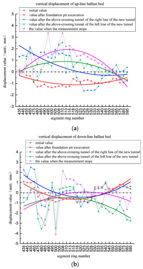 Vertical displacement of existing tunnels subjected to multiple disturbances. (a) Vertical displacement of up-line ballast bed subjected to multiple disturbances (b) Vertical displacement of down-line ballast bed subjected to multiple disturbances.