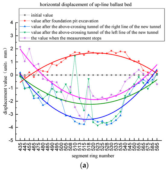 Vertical settlement occurred in the middle part of the down-line of the existing tunnel, and a slight uplift occurred at both ends during the excavation stage of the shield initial well. After the new right-line shield tunneling, the overall vertical displacement trend of the down-line remained consistent with the foundation pit excavation stage and did not change. After the above-crossing tunneling of the left-line shield, the middle part of the down-line was still in a slight settlement. However, the two ends changed significantly, from the original uplift to settlement. Considering that all the values were within the range , the change was still not significant. For the final phase of the stop test, the middle part of the down-line of the existing tunnel eventually returned to the initial state; yet, the two ends of the tunnel remained in the settlement state. Generally, the vertical displacement law of the down-line is most likely to be the up-line, and the polynomial curve has the same shape. Still, the interval range of its displacement value is more moderate than the up-line, and it always changes around the initial value.