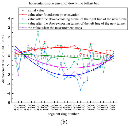 Similarly, the researchers utilized polynomials to present the curve fitting of the monitoring data, and the fitting results are shown in Figure 11. Figure 11 indicates the excavation of the pit at the shield initial well, which causes horizontal displacement toward the excavation direction of the existing tunnel. The displacement value of the middle part of the existing tunnel was the largest, measured at 1.85 mm. The displacement value of both ends gradually decreased and approached the initial value at the end, similar to the vertical displacement. This measured result is consistent with the research conclusions of Zheng et al. [59] and Meng et al. [60]. After the new right-line shield tunneling, the existing tunnel generated a severe horizontal displacement away from the foundation pit. The displacement value of the middle part of the existing tunnel was the largest, measured at −3.80 mm, and the displacement value of the two ends gradually decreased.
