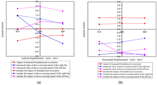 In Figure 5, Figure 6, Figure 10 and Figure 11, the results shown by the finite element software and the conclusions gathered from the analysis of the actual automatic monitoring data exhibit that the vertical and horizontal displacement laws of the existing tunnel structure are the same after multiple disturbances caused by the excavation of the foundation pit and the above-crossing of the newly built shield tunnel. Three representative sections were chosen: S513 and S528, intersecting the up-lines of Lines 7 and 1, and S520, corresponding to the middle of the foundation pit excavation face. By examining data from monitoring and numerical simulations at various construction stages, an in-depth analysis of the deformation patterns of the existing tunnel was conducted.