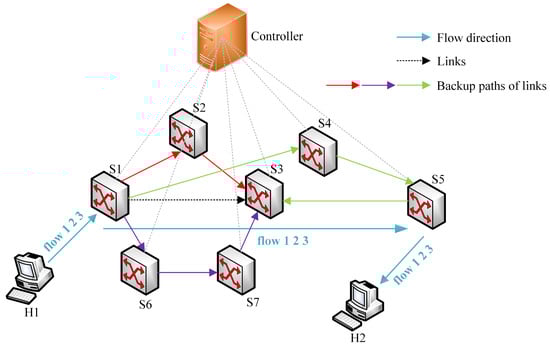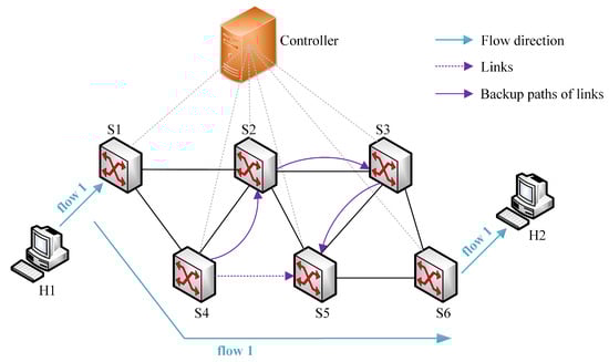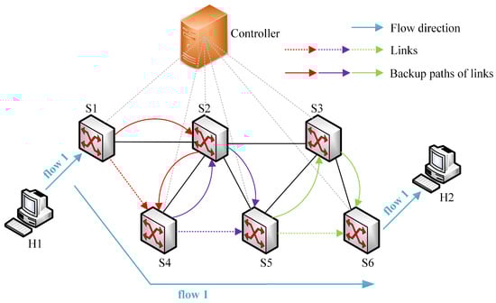 The proactive scheme involves pre-calculating the backup paths and installing them in the switches in advance, so that packets can automatically switch to backup paths when a link failure occurs. To explain the principle of the protection scheme explicitly, an example is shown in Figure 1. Assume host sends a flow, i.e., flow 1, to host , and its primary path is supposed to be ---. The potential failures are labeled in the figure in different colors, represented by red, purple, and green dashed lines, which correspond to failures of links -, -, and -, respectively. The backup paths for these three links are supposed to be --, --, and --, respectively. Since the focus of this paper is to solve single link failures, then these link failures will not occur simultaneously. As the proactive scheme is executed, these three backup paths are installed in the corresponding switches in advance, with bandwidth and other resources reserved. It is obvious that this scheme will consume a significant amount of internal resources in the switches. Moreover, if the network scale increases, the numbers of switches and flows increase as well, which may consume more internal resources of switches (for example, in this case, the required number of TCAMs will increase). In extreme cases, this can exhaust the resources of the switch, which can ultimately lead to poorer results of link failure recovery.