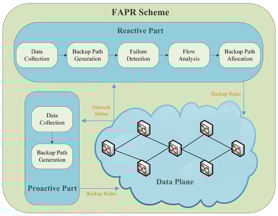 As mentioned before, our proposed link failure recovery scheme is called flow-aware pro-recover (FAPR). Note that “flow-aware” represents that our proposed scheme is “flow-aware”, which means that it allocates backup paths based on the characteristics of flows. “Pro-recover” represents that our proposed scheme combines the advantages of both the “proactive” scheme and “reactive” scheme. More specifically, “pro” refers to the pro-VLAN method [19]. The overall architecture of FAPR is shown in Figure 4, which is divided into two main parts. The proactive part mainly includes the data collection module and the backup path generation module, and the reactive part consists of five modules: data collection, backup path generation, failure detection, flow analysis, and backup path allocation.