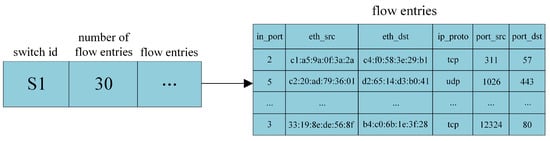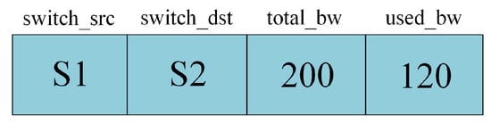 In the FAPR scheme, the information collected by the data collection module is divided into three parts, namely, switch information, link information, and events sent from the switch to the controller. More specifically, the standardized switch information includes the switch’s ID and the flow table entries stored in it, as shown in Figure 5. The standardized link information includes the ID of the source and destination switches of the link, the total bandwidth of the link, and the bandwidth that has been used, as shown in Figure 6. The events sent from the switch to the controller contain the packet information of flows, namely, a flow table entry, as shown in the right part of Figure 5. An event also contains the information related to the OpenFlow protocol version, parser, and timestamp involved. This module runs multiple times (for instance, when a port-status message is generated) and the information collected each time may not include all the items of the standardized information.