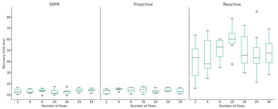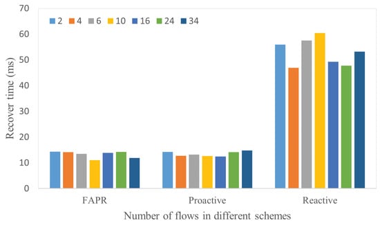 Figure 11 and Figure 12 show the numbers of backup flow rules required by the three schemes. The number of backup flow rules is the number of forwarding rules that need to be configured in switches before link failures happen, including flow table and group table entries, which cause extra consumption of switches’ TCAMs. As can be seen from Figure 11, the proactive scheme requires the most backup flow rules, and the reactive scheme requires the least. It can be explained as the proactive scheme needs to allocate a backup path for each flow, so the number of backup paths increases as the number of flows increases, and a backup path may correspond to multiple flow table and group table entries. The reactive scheme does not need to install any backup flow rules in advance. It only temporarily calculates backup paths and installs backup flow rules after a link failure, which is basically unrelated to the number of flows. No matter how the number of flows increases, the reactive scheme keeps the number of backup flow rules small and almost unchanged. The FAPR scheme combines the ideas of proactive and reactive schemes, and the number of backup flow rules needed lies somewhere in between. On one hand, FAPR adopts pro-VLAN to prepare backup paths before link failures, which can keep the number of backup flow rules independent from the number of flows. On the other hand, FAPR needs to calculate three backup paths for each link, and stores essential information into switches in advance, which leads to a slight increase of backup flow rules as the number of flows increases. However, the number of backup flow rules required by FAPR is always much less than the proactive scheme. When the number of flows is two, the backup flow rules required by the FAPR scheme are about of those required by the proactive scheme. Moreover, as the number of flows increases, this gap between FAPR and the proactive scheme becomes more pronounced. When the number of flows increases to 4, 6, 10, 16, 24, and 34, the corresponding ratio between FAPR and the proactive scheme is reduced to about , , , , , and between FAPR and the proactive scheme.