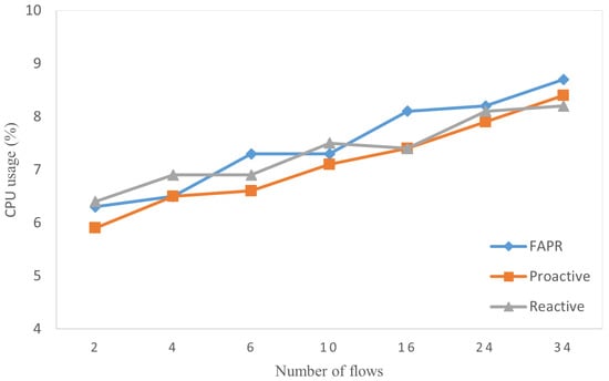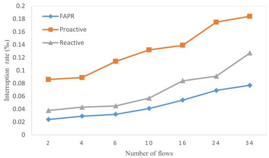 As shown in Figure 10, when the number of flows increases, the flow interruption rates of the three schemes increase as well. However, under the same experimental conditions, the flow interruption rate of the FAPR scheme is always lower than the other two schemes. Among these three schemes, the proactive scheme corresponds to the highest flow interruption rate. This can be explained by the fact that the proactive scheme deploys flow rules in advance in switches, and does not consider the real-time network view. When link failure occurs, flows may forward along multiple backup paths that contain the same link, leading to congestion or interruption. Compared with the proactive scheme, the reactive scheme considers the real-time view of the network, so it performs better. Unlike the other two schemes, the FAPR scheme has the lowest interruption rate by classifying different types of flows and assigning the most suitable path to each flow, thus avoiding over-concentration of flows.