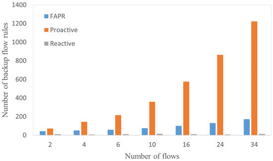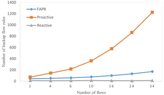In addition, Figure 12 shows the trend of the numbers of backup flow rules required by the three schemes as the number of flows increases. The proactive scheme needs the most backup flow rules, and the number of backup flow rules increases with exponential growth as the number of flows increases. It can be inferred that, when the number of flows increases further, the number of backup flow rules required by the proactive scheme may even exceed the number of primary flow rules, which is unacceptable. The reactive scheme keeps the number of backup flow rules basically stable with low volatility. The FAPR scheme also lies somewhere in between, and the number of backup flow rules increases with linear growth, which is applicable in practice.