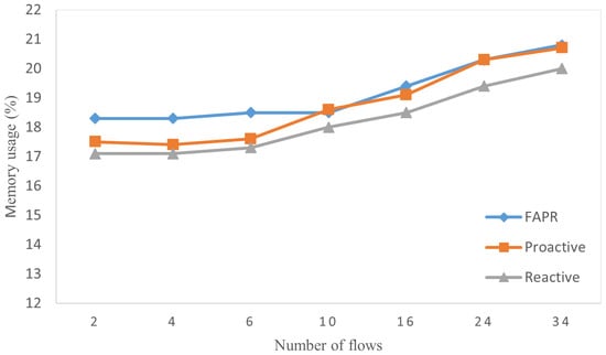 Figure 13 and Figure 14 show the CPU utilization and memory utilization of these three schemes, respectively. The CPU and memory utilization refer to the amount of CPU and memory resources consumed by the entire network simulation program when it is fully operational. When the system is not running the simulated network environment, the CPU utilization is about and the memory utilization is about . As seen from these two figures, there is only a slight increase in the CPU utilization and memory utilization of the three schemes as the number of flows increases. Benefiting from the resource management and scheduling mechanisms of the operating system, as well as the high performance of modern computer systems, fluctuations of CPU and memory utilization exist while within a very small range. In addition, it can be observed that there is no significant difference in CPU usage and memory usage among these three schemes. In conclusion, when compared with the other two schemes, the FAPR scheme does not cause additional hardware resource costs, which is applicable in practice.
