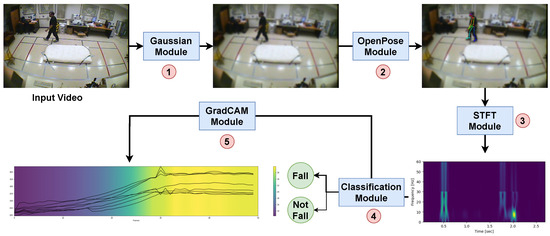 Figure 2, the proposed architecture consists of five main modules, each playing a crucial role in the fall-detection system. First, the Gaussian module ensures the protection of individual privacy by applying a video obfuscation technique to the video input. Next, the OpenPose module utilizes the OpenPose network to extract key points from the video. The STFT module serves a dual purpose. It optimizes computational resources and provides insights into the contextual information regarding fall events. This contextual information helps understand the sequence of events and detect any unusual motions or patterns preceding the sudden fall. The extracted frames are then fed into the classification module, which learns and identifies key point patterns associated with falls and non-fall movements. Lastly, the GradCAM module employs convolution layers to generate sequence heat visualization. This visualization aids in understanding the reasoning behind the fall-detection outcomes. It highlights the temporal variation in the key points contributing to the classification decisions. Further details on each module are discussed in the subsequent section.