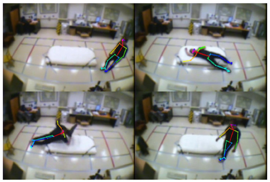 Figure 6. These results showcase the key points extracted from subjects in various videos, providing valuable insights into body movements and postures. Such accurate extraction enables further analysis and the subsequent prediction of falls. Although the OpenPose module successfully extracted most of the key points from the frames, there were instances where it failed to detect the person or generated key points randomly within the frames. To address this issue, we applied data preprocessing techniques and employed linear interpolation to manage these occurrences.