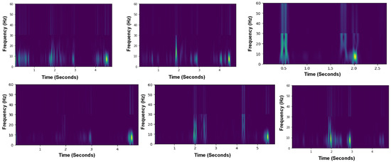 Subsequently, the STFT is applied to each windowed frame, converting the velocity signals from the time domain to the frequency domain. This conversion allows us to construct a spectrogram that visualizes the intensity and frequency of motion data over time. In the spectrogram, some visible patterns often correspond to vigorous activities, which may indicate a fall or some motion activities. Such visual representation is helpful as it allows for the easy identification of high-motion activities such as falls by highlighting sudden increases in frequency. Conversely, low-motion activity like sleeping or sitting manifests differently in the spectrogram as they do not produce patterns. This visualization helps differentiate falls from low-motion activities and high-motion activities, thus enhancing the fall-detection system’s reliability and accuracy.