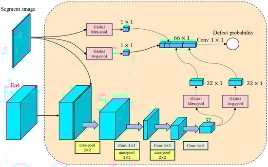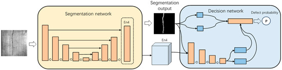 The proposed architecture is illustrated in Figure 1. The model consists of two-stage networks: the segmentation network and the decision network. Utilizing the enhanced U-Net as the segmentation network for this design, the last decoding layer of the improved U-Net is connected to the segmentation results as the input for the decision layer. The decision layer outputs the probability of the presence of defects.