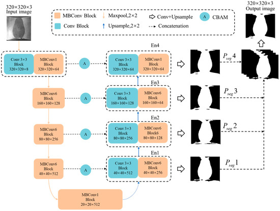 The segmentation structure used in this paper is illustrated in Figure 2, incorporating MBConv and a multi-scale fusion mechanism to amplify segmentation accuracy while maintaining efficiency. The pivotal component module of the segmentation network in this study is the MBConv block, where the 5 × 5 convolution kernel is substituted with a 3 × 3 convolution kernel to curtail computational costs and parameters. In the proposed methodology, MbConv1, 3 × 3 signifies an MBConv block layer with an expansion factor of 1 and a convolution kernel size of 3 × 3 (as delineated in Section 3.1.1). The expansion factor denotes the number of output channels compared to the input channels in the expansion convolution. Likewise, for MBConv6, k3 × 3 designates an MBConv block layer with an expansion factor of 6 and a convolution kernel size of 3 × 3. For comprehensive network efficiency, MBConv1 is employed in the encoding and decoding layers of the initial two layers. It is essential to maintain consistency in the MBConv block types at corresponding positions in the encoder and decoder within the MBConv encoder-decoder architecture. This ensures improved compatibility between the encoder and decoder.