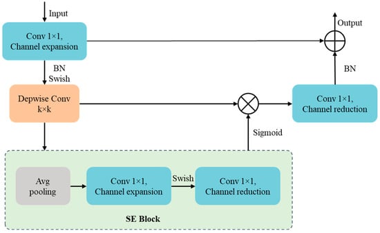 The MBConv structure, as shown in Figure 3, consists primarily of a 1 × 1 regular convolution (for dimensionality expansion, including BN and Swish activation), a k × k depthwise convolution (including BN and Swish activation, where the specific value of k can be 3 × 3 or 5 × 5, as seen in the EfficientNet-B0 architecture), an SE (squeeze-and-excitation) module, and a 1 × 1 regular convolution (for dimensionality reduction, including BN), followed by a dropout layer.