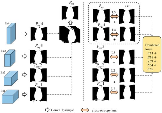 After the output of each block in the decoder is obtained, as illustrated in Figure 4, we use a 1 × 1 convolutional kernel to reduce the number of feature channels. Subsequently, the probability map is restored to the original size through deconvolution. Finally, these probability maps are stacked, and the final prediction result is generated through a 1 × 1 convolution. The advantage of this approach lies in its ability to better capture feature information at different levels in the image while addressing the imbalance between foreground and background pixels.