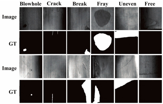Examples of magnetic tile surface defects, labeled with pixel-level ground truths (GTs).